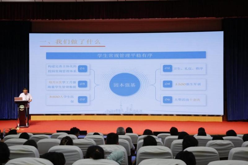 会议第一阶段,学校教务处、学发处、后勤处分别进行学年工作汇报。教务处处长殷莉以“深耕教学创新赋能提质,聚焦多维发展深化内涵”为题,以一抓手、双重点、三优化为脉络总结了学年主要工作及取得的成绩,并对存在的不足进行了分析诊断并就新学期工作进行了展望。学发处处长石荣锦以“学生管理工作的数据、行动、思考”为题进行汇报,以数据的形式总结了本学年学生管理主要工作,以具体案例分享了工作经验,并就存在的不足及改进方向进行了思考和展望。后勤处处长徐波以“凝心聚力,务实笃行,做有温度的后勤服务”为题分享了后勤服务处主要工作,包括稳步推进重大项目建设、切实提高常规服务质量、扎实做好资产管理工作,并就下一步努力方向作了思考,以全面提升服务水平。