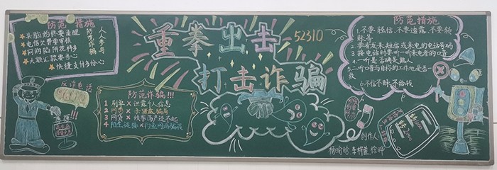 本次黑板报创作活动为同学们普及了预防电信网络诈骗的相关知识和技巧,使同学们具备了应对诈骗的能力,并提高了大家对电信网络诈骗的防范意识,让大家更深入地了解这类犯罪的手段和危害,比如一些不法分子会假冒公检法人员,谎称受害人涉嫌犯罪,要求其转账到所谓的“安全账户”,还有的会以网络刷单返利为诱饵,骗取受害人的钱财
